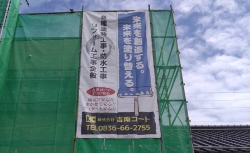 山口市の屋根外壁塗装工事の現場でコーキングの打ち替え作業をしています。