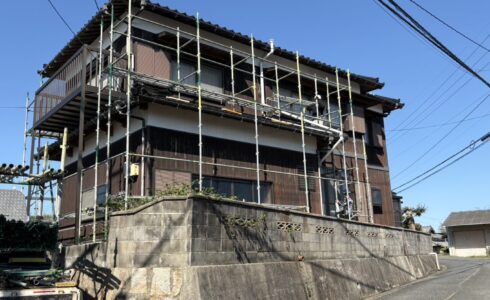 山口市のマンションでは廊下の床工事をしています。 先日、既存シートをはがしたので今日は新しいシートを貼っています。