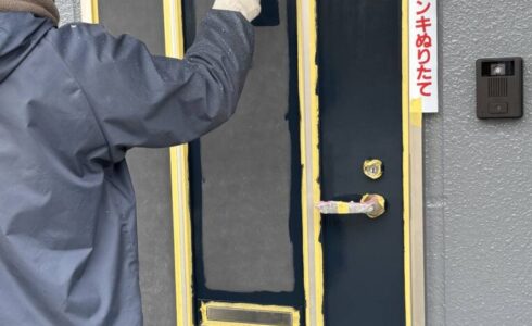 玄関のドアを塗装中