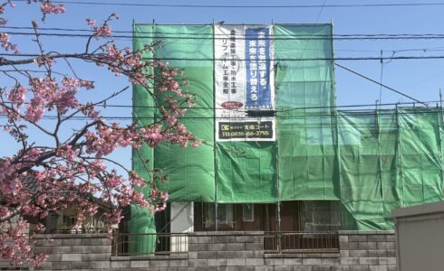 洗浄前にスレートの重なり部分から漏れる洗浄水で農機具等が濡れないようにブルーシートで覆っています。 濡れ防止対策 高圧洗浄中 丁寧に洗浄してから塗装工程に入ります 長期に渡り付着していた苔や土等が飛散防止ネットにくっついてます