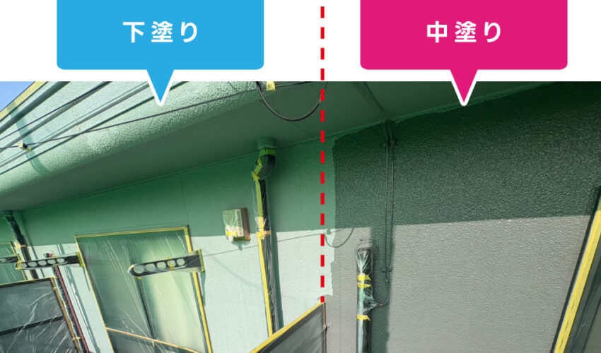 防府市のアパート外壁塗装工事では、養生をして外壁下塗り〜中塗りをしています。