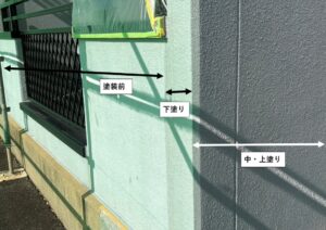 下の写真は塗装の経過が分かる写真です。 左から 塗装前、下塗り、中・上塗り となっています。 だんだん色が変化しているのが分かります。