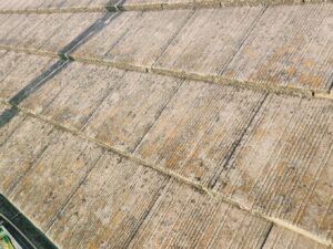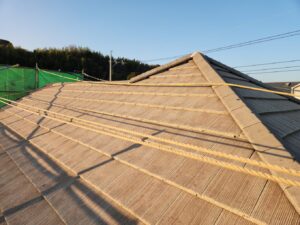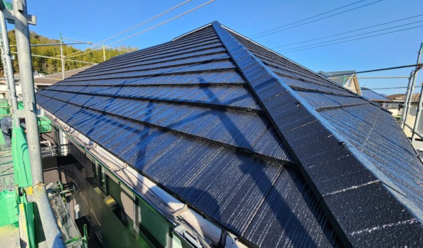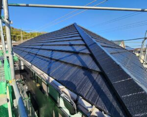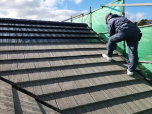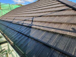 山口市の屋根外壁塗装工事では、屋根の塗装をしています。 まずセメント瓦専用のマイティ―シリコンを塗布し次にタフグロスコートを塗布すると、美しい光沢のある屋根に仕上がります。