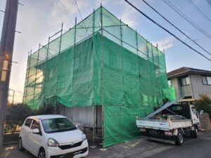 ネット設置 養生 洗浄前 洗浄後 屋根塗装1回目塗布作業中 屋根塗装2回目塗布完了 クリア塗料塗布完了