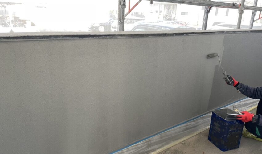 山口市のマンションで廊下の外壁の上塗りをしました。