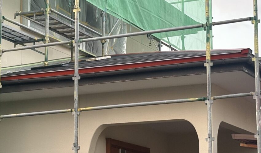 山口市で屋根・外壁塗装工事をしています。 この日は屋根の錆止め作業をしました。 写真の赤い部分が錆止めを施した箇所です。