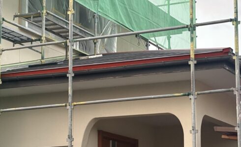 台風シーズンの7月中旬から9月に毎年2~3回は足場に張っているネットを縦管に括り付け写真の様にスケルトン状態にしています。ネットを張ったままでは風圧で足場が倒壊する恐れがあります。安全を第一に事前の対策をしっかりとってます。